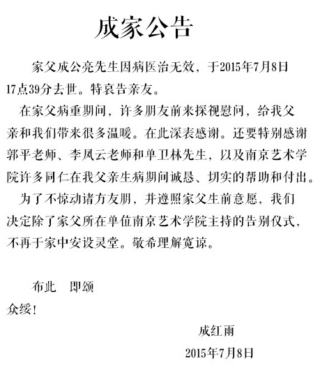 7月8日17點(diǎn)39分,一代古琴大師、國家級(jí)非遺古琴代表性傳承人成公亮先生因病醫(yī)治無效,于南京逝世,享年75歲。