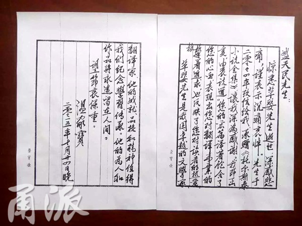 “這封信是昨晚溫總理在看到網(wǎng)絡媒體報道后,主動寫的。今天上午他的辦公室先傳真到北京的中國翻譯家協(xié)會,翻譯家協(xié)會在中午12點用微信發(fā)到家屬的手機上的。信函原件將通過中國翻譯家協(xié)會寄到上海市文聯(lián),再轉(zhuǎn)交給家屬。”方之岡告訴甬派記者,草嬰從事翻譯工作數(shù)十年,翻譯了列夫·托爾斯泰的全部小說作品,他的翻譯作品曾多次被國家領(lǐng)導人作為國禮,在出訪時送給外國元首。