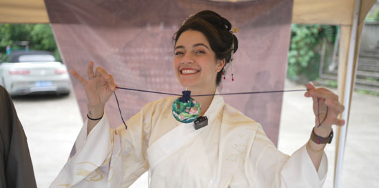 Several booths were set up for the event, including the one selling the local summer treat, iced bean jelly with waxberries. Many ingredients were available for tourists to customize their bean jelly. Marina got a large bowl of iced bean jelly topped with a variety of fruits, including waxberry, lychee, yellow peach, and pitaya, as well as nuts. Its sweet-sour flavor and chewy texture make it a summertime favorite among locals. Marina’s curiosity was aroused after tasting the local sweets, which had a unique aroma that gave her a sense of calm and beat the summer heat. She approached a booth where several traditional scented sachets were displayed, as well as various glass bottles containing different Chinese herbs. Ancient Chinese people mixed Chinese herbs in sachets to repel mosquitoes and bugs in the summer, as introduced by the stand’s owner. It is still popular to this day, with people carrying scented sachets as perfume or hanging them indoors. Marina also got a chance to learn how to make a small sachet, in which she put cloves, sweet pine, peony bark, and borneol. Strolling down the booths, Marina noticed people were throwing arrows from a set distance into a canister at one stand. She walked over the stand and asked what they were doing. The owner explained it as a traditional Chinese game from the Warring States Period. If the arrows are thrown into the canister, the players score points. Marina tried several times and won bonus points for successfully throwing arrows into a smaller canister.